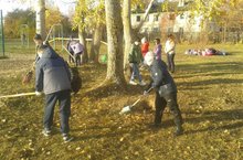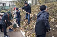 Учащиеся убирают листья с территории и готовят газоны к зиме