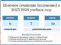 Итоговое сочинение (изложение) в 2023-2024 учебном году. Определены сроки и места регистрации участников итогового сочинения (изложения) в 2023-2024 учебном году Даты проведения итогового сочинения (изложения): 6 декабря 2023 года, 7 февраля 2024 года, 10 апреля 2024 года. Выпускники текущего года пишут итоговое сочинение (изложение) 6 декабря 2023 года. Для них сочинение (изложение) является обязательным. Регистрация осуществляется в образовательных организациях, где они обучаются. В случае получения «незачета» они имеют право переписать итоговое сочинение 7 февраля 2024 года, 10 апреля 2024 года. Выпускники прошлых лет смогут написать сочинение в любой из вышеуказанных дней. Участие в сочинении для данной категории лиц не является обязательным. ????Напоминаем, что заявления об участии в итоговом сочинении (изложении) подаются не позднее чем за две недели до начала проведения итогового сочинения (изложения): срок подачи заявления для участия в написании итогового сочинения (изложения) 6 декабря 2023 года завершается 22 ноября 2023 года, для участия в написании итогового сочинения (изложения) 7 февраля 2024 года – 24 января 2024 года, для участия 10 апреля 2024 года – 27 марта 2024 года. Итоговое сочинение (изложение) является допуском к государственной итоговой аттестации. 09.11.2023