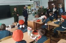 Выступление перед учащимися 5и класса курсанта Рязанского высшего воздушно-десантного командного училища имени генерала армии В. Маргелова Мингазова Риваля и курсанта Новосибирского высшего военно-командного ордена Жукова училища Горячева Никиты с информационной беседой по обучению и поступлению в данные военные учреждения. 28.12.2022