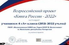Весной 2022 года 4 а класс ( сейчас 5 а) принял участие во Всероссийском проекте " Книга России". Материал был представлен на Всероссийском форуме классных руководителей. 15.01.2023