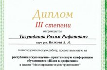 Поздравляем Тазутдинова Р ученика Васильевской КШИ за 3 место в Республиканской научно- практической конференции " Шаги в профессию , секция " Моделирование и конструирование", педагог Волкова А. А. 06.05.2022