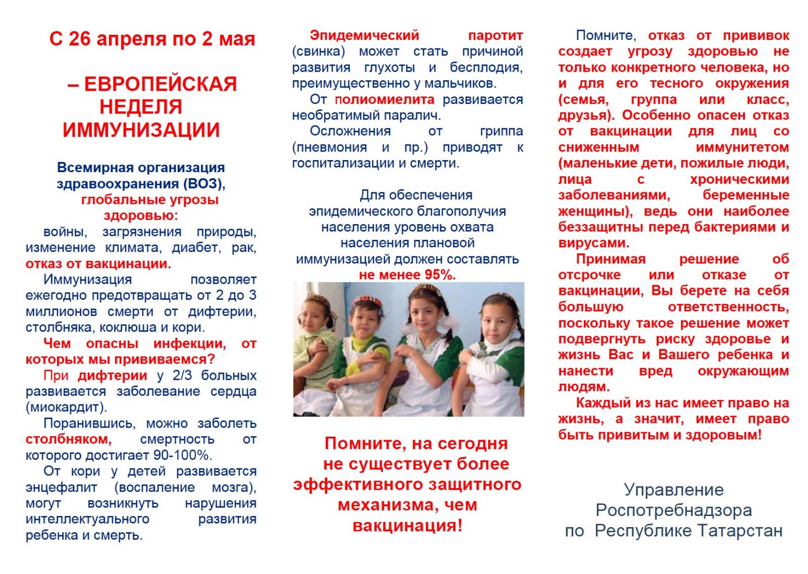 Опубликовано: 29.04.2021С 26 апреля по 2 мая – ЕВРОПЕЙСКАЯ НЕДЕЛЯ ИММУНИЗАЦИИ Всемирная организация здравоохранения (ВОЗ), глобальные угрозы здоровью: войны, загрязнения природы, изменение климата, диабет, рак, отказ от вакцинации. Иммунизация позволяет ежегодно предотвращать от 2 до 3 миллионов смерти от дифтерии, столбняка, коклюша и кори. Чем опасны инфекции, от которых мы прививаемся? При дифтерии у 2/3 больных развивается заболевание сердца (миокардит). Поранившись, можно заболеть столбняком, смертность от которого достигает 90-100%. От кори у детей развивается энцефалит (воспаление мозга), могут возникнуть нарушения интеллектуального развития ребенка и смерть. Эпидемический паротит (свинка) может стать причиной развития глухоты и бесплодия, преимущественно у мальчиков. От полиомиелита развивается необратимый паралич. Осложнения от гриппа (пневмония и пр.) приводят к госпитализации и смерти.