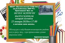 Уважаемые выпускники Васильевской средней общеобразовательной школы №2 имени Героя Советского Союза Николая Соболева ЗМР РТ! Приглашаем вас на торжественный и традиционный Вечер встречи школьных друзей, который состоится 25 января в 17ч00 мин. в актовом зале школы.