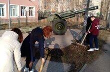 Юнармейцы школы проводят весеннюю уборку от мусора на территории стеллы "Ковавшим победу".