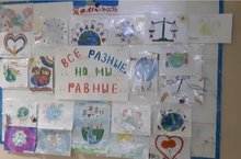 В фойе школы в рамках плана мероприятий по профилактике экстремизма, развитию толерантности, формированию конструктивных межэтнических и межнациональных отношений в воспитательном пространстве прошла выставка рисунков "Мы разные, но равные"