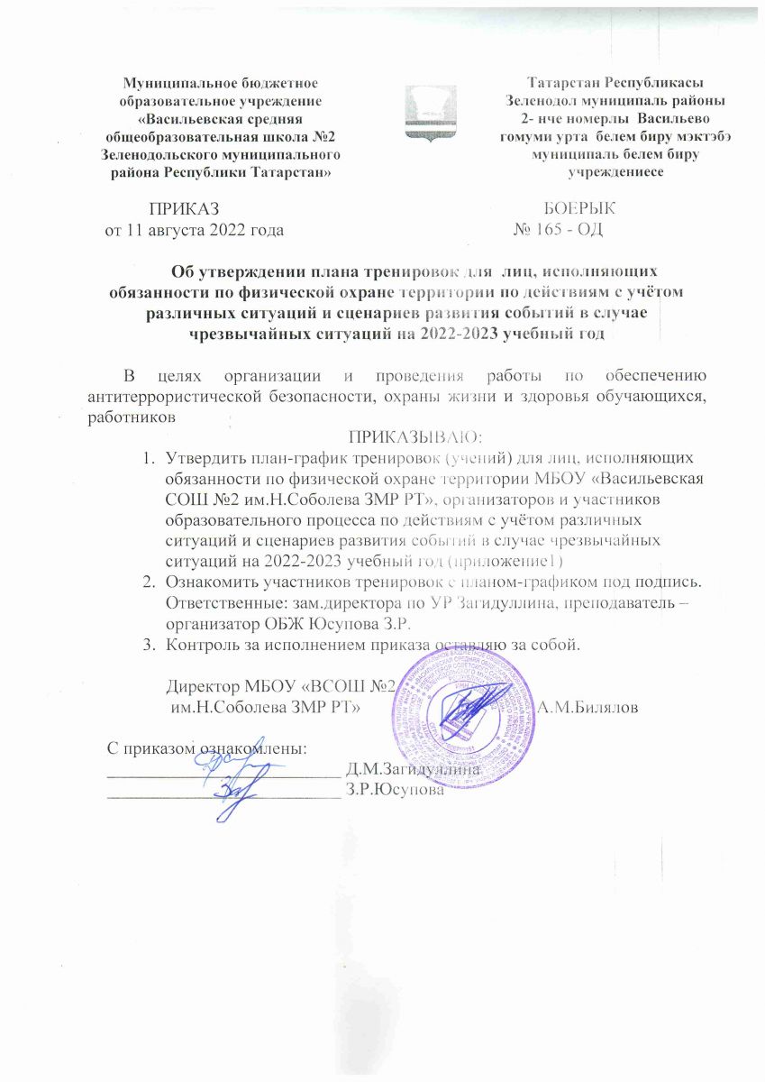 Приказ об утверждении плана тренировок для лиц, исполняющих обязанности по физ.охране