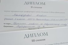 Сегодня в X республиканском конкурсе научно-исследовательских, проектных и творческих работ дошкольников и младших школьников "Край родной, навек любимый", посвященный году педагога и наставника наши ученики заняли призовые места. Ученица 1 класса Гарифуллина Самира заняла 2 место, а учащиеся 4 класса Магафурова Альбина и Фахрисламов Самир заняли 3 место. От всей души поздравляем учащихся и учителей подготовивших победителей! Бүген педагог һәм остаз елына багышланган "Мәңгелеккә яраткан туган ягым" X Республика фәнни-тикшеренү, проект һәм иҗади эшләр конкурсында безнең укучылар призлы урыннар яуладылар. 1 нче сыйныф укучысы Гарифуллина Самира 2 нче урынны алды, ә 4 нче сыйныф укучылары Магафурова Альбина һәм Фәхрисламов Самир 3 нче урын яуладылар. Укучыларыбызны һәм укытучыларны котлыйбыз!
