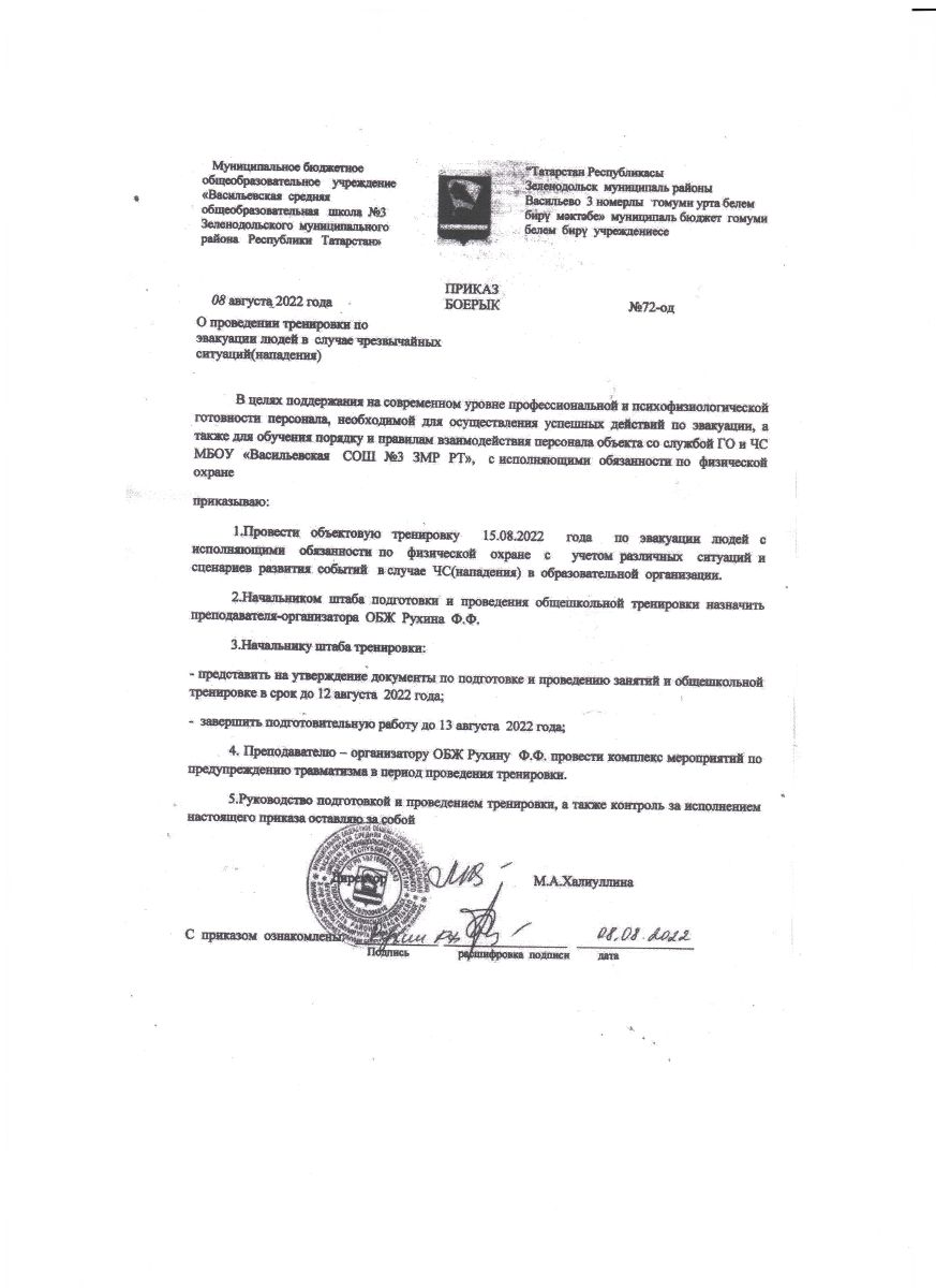 Приказ о проведении тренировок по эвакуации людей в случае ЧС от 08.08.2022 № 71-од
