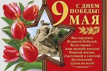 Поздравляю с Днём Победы и от всего сердца желаю жить под чистым небом, ходить по зелёной нетронутой траве, мечтать обо всём прекрасном и непременно добиваться исполнения всех своих желаний. Пусть ни наше, ни следующие поколения не забывают великих подвигов, пусть на нашей планете будет мир и правит любовь. С праздником, дорогие ребята, уважаемые родители и коллеги!