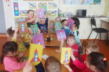Без балалар белән кисеп ябыштыру шөгылендә "Айга менү" темасына эшләдек. Балалар бик теләп ракета кисеп ябыштырдылар.