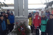 В рамках мероприй военно-патриотического месячника учащиеся нашей школы участвовали в акции "Цветы у Обелиска". Почистив дорожку к памятнитнику от снега, возложили венок, сделанный своими руками.