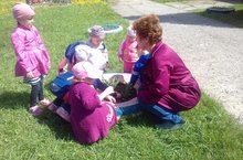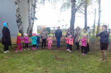 Балалар тәрбияче апалары белән бергәләшеп чәчәкләрнен чупләрен утадылар.