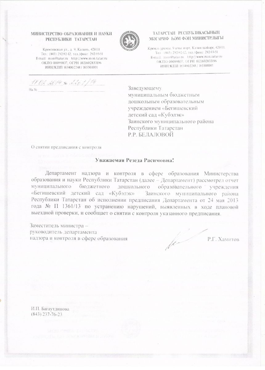 В результате мероприятия по надзору, проведенного в соответствии с приказом департамента надзора и контроля в сфере образования Министерства образования и науки Республики Татарстан от «10» апреля 2013 г. № 1361/13 в отношении Муниципального бюджетного дошкольного образовательного учреждения «Бегишевский детский сад «Кубэлэк» Заинского муниципального района Республики Татарстан, были выявлены нарушения (предписание департамента надзора и контроля в сфере образования Министерства образования и науки Республики Татарстан от «24» мая 2013 г. № П 1361/13).