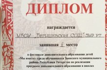 В фестивале дополнительного образования детей "Мы вместе" среди обучающихся Заинского муниципального района Республики Татарстан по реализации программ дополнительного образования в школах в номинации "Художественная" наша школа заняла 2 место. Молодцы!