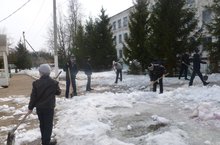 Бүген укучылар мәктәп янында карларны чистарттылар.