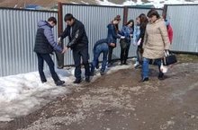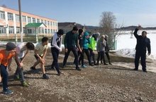 В рамках экологического санитарного двухмесячника учашиеся школы вышли на улицу и школьный двор, чтобы очистить их от зимнего мусора. Юноши 9 класса ворошили снег на школьной территории.