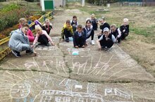 Учащиеся начального звена присоединились к акции "Яркий город" в рамках осенней недели добра. Они рисовали на асфальте добрые рисунки и территория школы заиграла новыми красками.