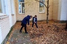 Продолжается уборка территории школы от опавшей листвы.