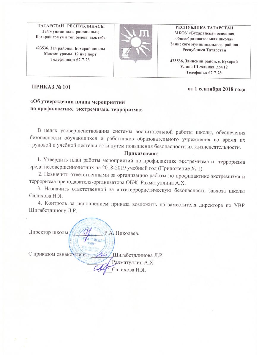 Приказ об утверждении плана мероприятий по профилактике терроризма и экстремизма