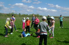 Кояшлы көннән файдаланып калырга теләп, хезмәт һәм ял лагерьына йөрүче балалар стадиондагы печәнне җыйдылар.