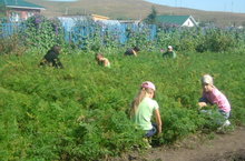 Мәктәп бакчасында практика үтүче балалар түтәлләрне чүптән арындыралар.