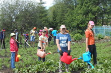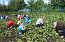 Иртәнге якта балалар мәктәп бакчасында, чәчәклектә чүп үләннәре утадылар, аларга су сиптеләр. Хезмәт белән ял чиратлашып бара. Эштән туктауга саф һавада спорт уеннары уйнадылар.