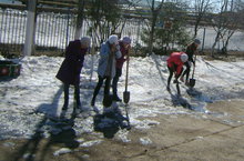 Учащиеся старших классов вышли на уборку территории школы от снега.