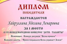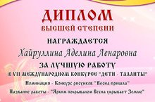 Поздравляем Хайруллину Аделину, получившую диплом высшей степени VII международного конкурса «Дети – таланты» за работу «Ярким покрывалом Весна укрывает Землю» (педагог Васильева В.Н.) Молодцы! Желаем дальнейших успехов.