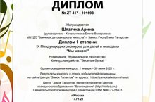 Учащаяся отделения музыкального искусства Шпагина А. приняла активное участие в Ⅸ Международном конкурсе для детей и молодежи «Мы можем!» и стала победителем – I место (ПДО Котельникова Е.В.). Поздравляем!!!