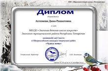 Победителями данного конкурса стали : Ахтямова Дина –1 место, Ахтямова Рената -1 место, Бахтиева Эвелина –диплом Лауреата (ПДО Дмитриева Е.Н.), Мирофанова Виктория -2 место, Овчинникова Варвара – 3 место (ПДО Баширова Э.И.). Поздравляем!!!