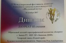 26 ноября Образцовый детский хореографический коллектив «Каприз» участвовал в Открытом Республиканском фестивале-конкурсе национального татарского искусства "Бэхет йолдызы". Награждены дипломом Лауреата 1 степени (2 младшая группа 7-10 лет) и дипломом 1 степени (средняя группа 11-13 лет) ПДО Маркелова Р.А.. Поздравляем!