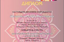 Поздравляем Шатунову Азалию, занявшую 1 место во Всероссийском творческом конкурсе «Беренчелек» (ПДО Инюшева М.М.).