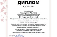 Поздравляем Асылхузину Асылъяр, занявшую 1 место во ІІ Всероссийском конкурсе для детей и молодежи «На взлёте» (ПДО Инюшева М.М.).
