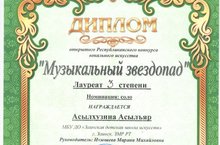 Поздравляем Асылхузину Асылъяр , ставшую лауреатом 3 степени в открытом Республиканском фестивале-конкурсе вокального искусства «Музыкальный звездопад» (педагог Инюшева М.М.).