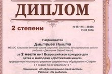 Поздравляем Дмитриева Никиту, занявшего 2 место во II Всероссийском конкурсе для детей и молодёжи «Достижения юных» (педагог Дмитриев С.И.).