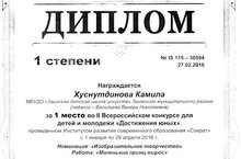 Поздравляем Хуснутдинову Камилу, занявшую 1 место во II Всероссийском конкурсе для детей и молодёжи Достижения юных». Номинация: «Изобразительное творчество» (педагог Васильева В.Н.). Молодцы! Желаем дальнейших успехов.
