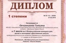 Поздравляем Овчинникову Татьяну, занявшую 1 место во II Всероссийском конкурсе для детей и молодёжи Достижения юных». Номинация: «Изобразительное творчество» (педагог Дмитриев С.И.). Молодцы! Желаем дальнейших успехов.