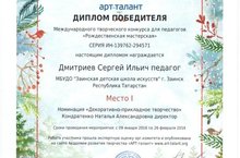 Поздравляем Дмитриева С. И., педагога отделения изобразительного искусства, занявшего 1 место в Международном творческом конкурсе «Красавица зима» в номинации «Декоративно – прикладное творчество».