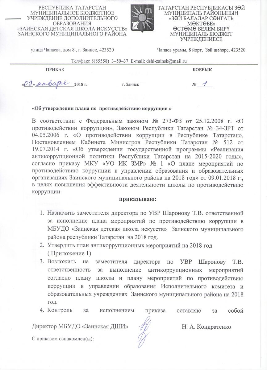 План антикоррупционных мероприятий МБУДО "Заинская ДШИ" на 2020 год