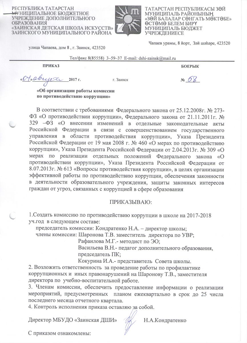 Приказ №58 «Об организации работы комиссии по противодействию коррупции»