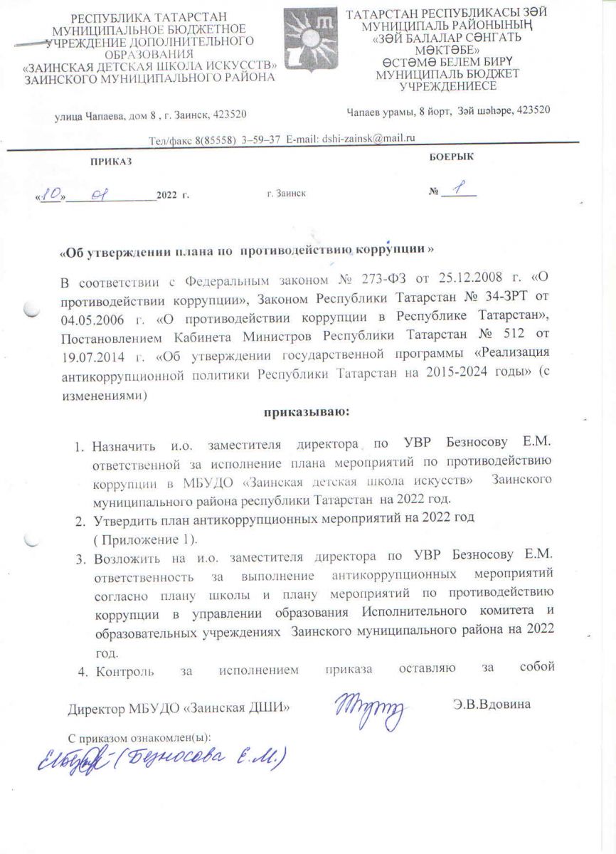 План антикоррупционных мероприятий МБУДО "Заинская ДШИ" на 2022 год