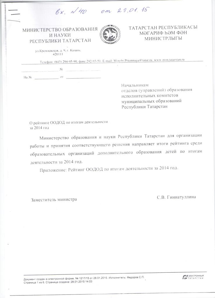 Письмо МОиНРТ о рейтинге ООДОД по итогам деятельности за 2014 год.