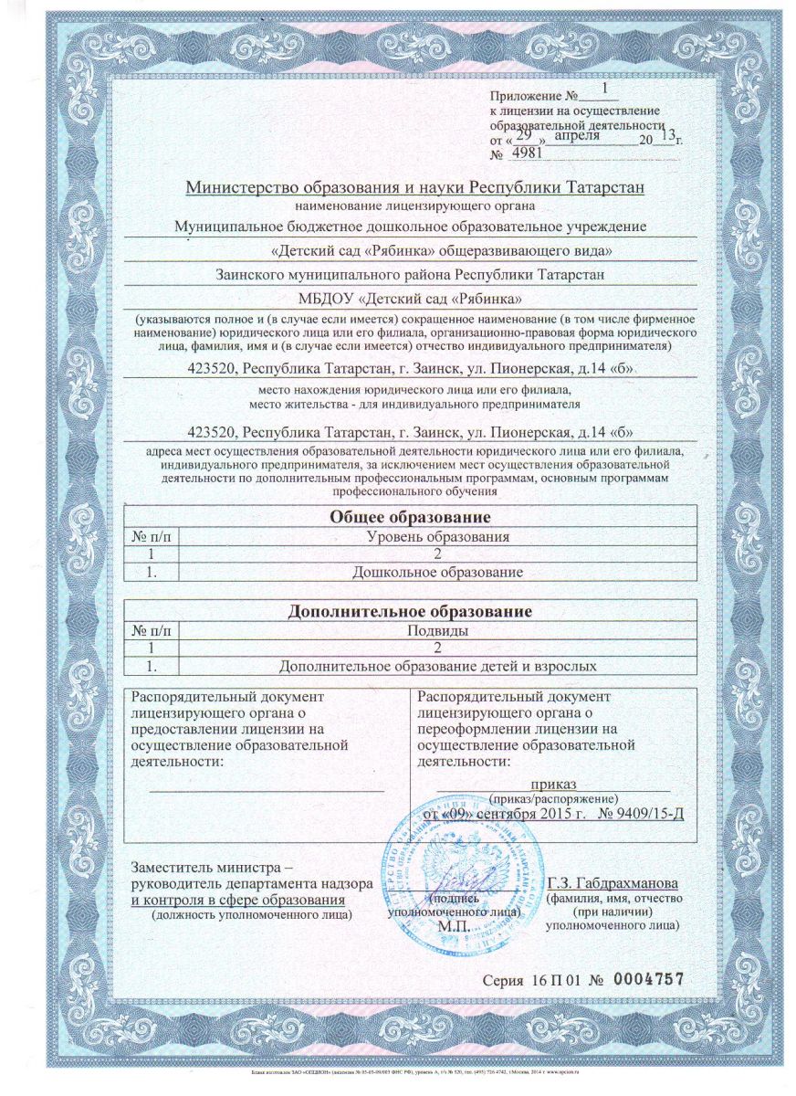 Приложение к лицензии на образовательную деятельность, дополнительное образование