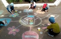 Сегодня дети старшей группы приняли участие в конкурсе рисунков на асфальте "Мое безопасное детство". Главный персонаж на рисунке - солнце - светофор, вместо лучиков которого, разные дорожные знаки.