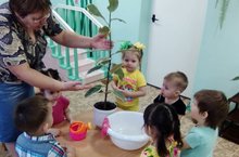 Детки 1 младшей группы знакомятся сегодня с "жителем" уголка природы - комнатным цветком Фикусом. Воспитатель, Галина Петровна, предлагает малышам рассмотреть его большие листья, показывает как надо ухаживать за цветком, чтобы он радовал всех своим видом.