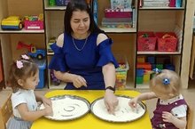 СЕГОДНЯ ДЕТИ ЯСЕЛЬНОЙ ГРУППЫ РИСОВАЛИ МАННОЙ КРУПОЙ НА ПОДНОСЕ.