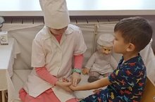 Вот и наши воспитанники с удовольствием поиграли в сюжетно-ролевую игру "Поликлиника", где доктор это человек добрый и заботливый, которому можно доверять. Укол юный врач тоже сделает недрогнувшей рукой. А заодно – усвоит, что ничего страшного в этом нет. -