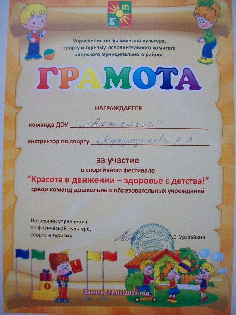 ГРАМОТА ЗА УЧАСТИЕ В СПОРТИВНОМ ФЕСТИВАЛЕ "КРАСОТА В ДВИЖЕНИИ - ЗДОРОВЬЕ С ДЕТСТВА"