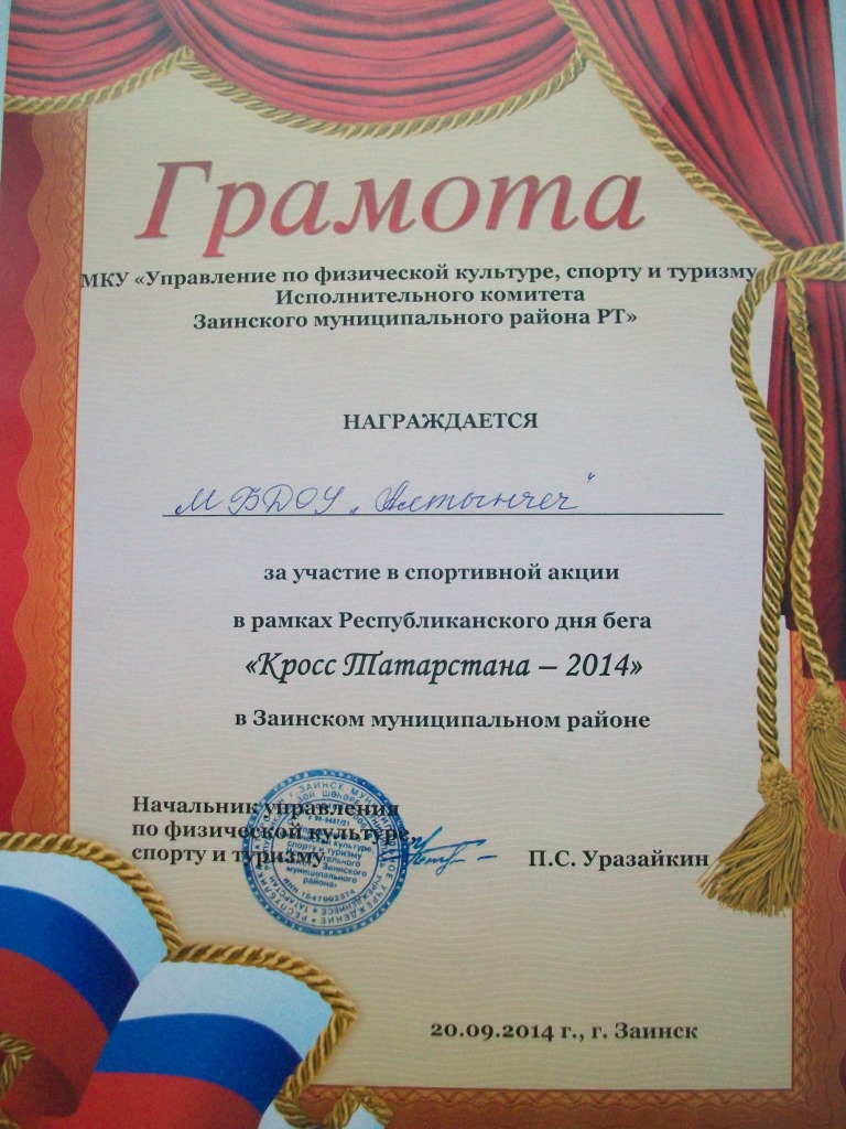 ГРАМОТА ЗА УЧАСТИЕ В "КРОССЕ ТАТАРСТАНА-2014"