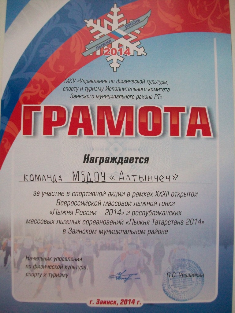 ГРАМОТА ЗА УЧАСТИЕ В "ЛЫЖНЕ РОССИИ"